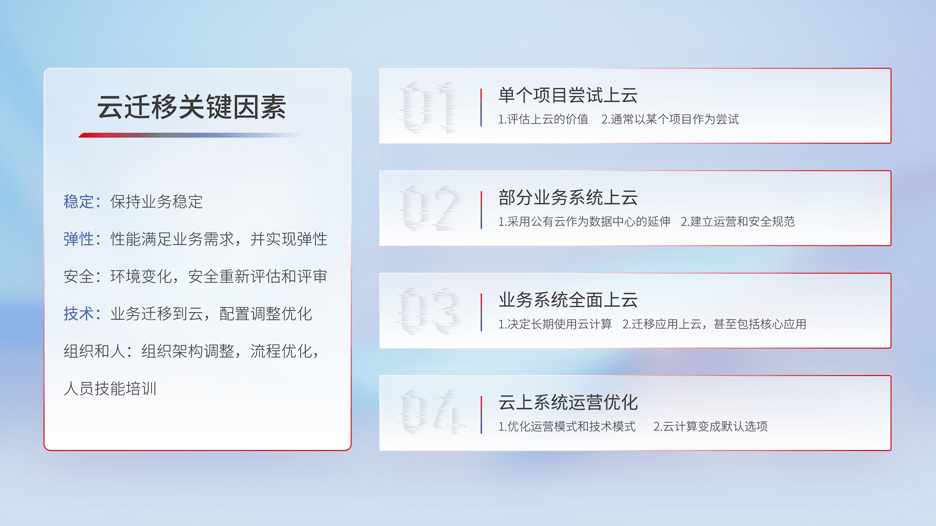 结合实际业务,,,从规划设计、、、、云平台选型、、云原生改造、、数据迁移、、、集成交付,,,,迁移全过程为客户识别最佳上云路径,,,,做好风险识别管理,,,设计网络架构、、、、身份权限、、、、安全审计合规、、操作审计、、、、日志审计、、监控告警策略、、、多站点容灾设计等,,,对云上基础设施进行整体规划,,,,提升IT治理水平,,,以满足弹性、、、高可用、、、、高性能的需求。。