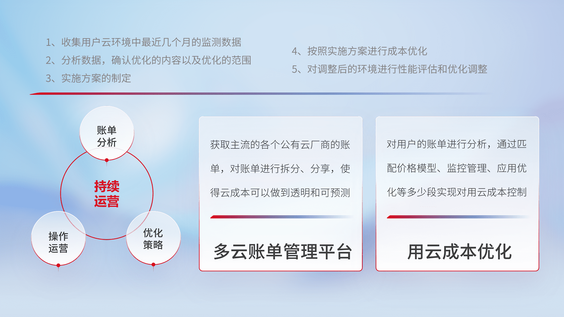 通过多云纳管,,以统一的资源数据模型把客户的云资源进行抽象和封装,,进而实现对多云资源的统一操作,,,,保障云资源管理的可靠性、、、稳定性与可用性。。量身定制化运维内容,,配置、、、开发运维、、补丁管理、、备份、、、、监控、、认证和访问管理、、、、审计和日常巡检等,,保障在用云过程中的可靠度,,稳定度以及高可用率。。。